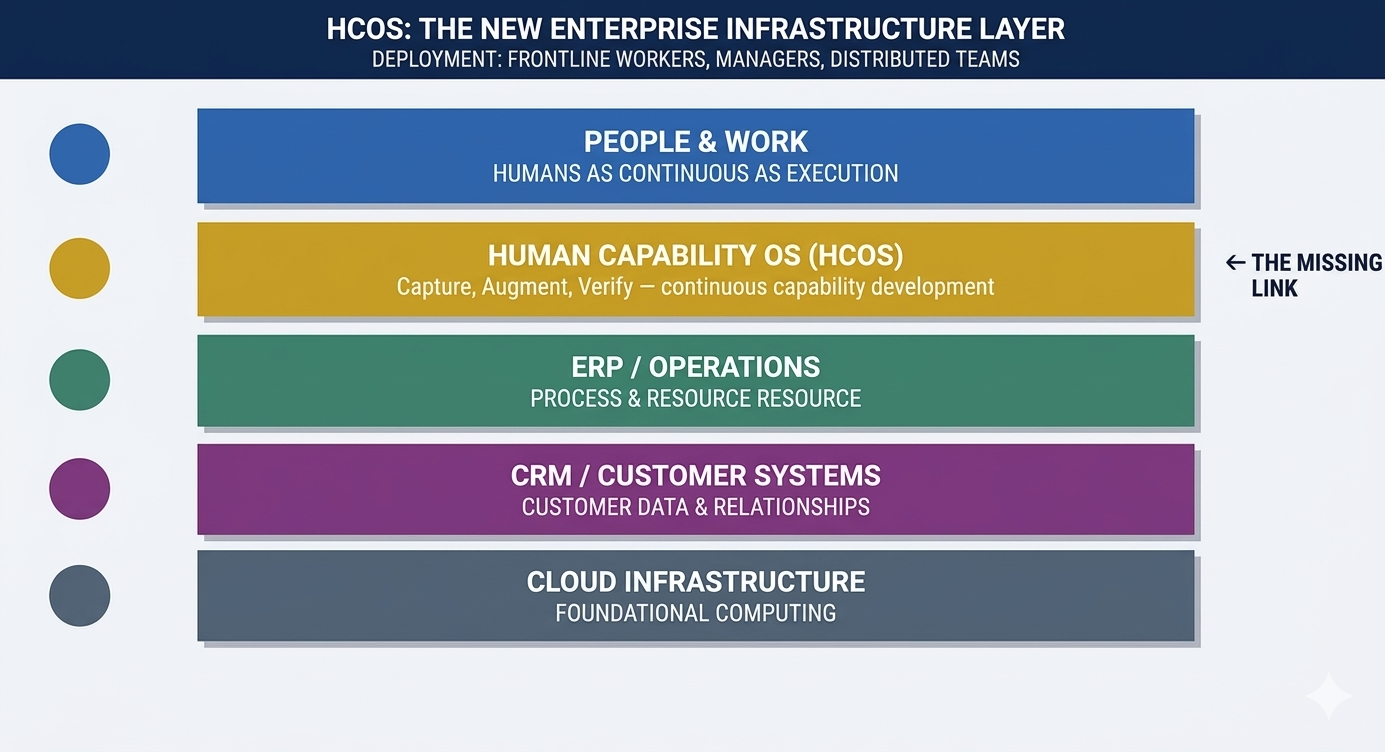 This paper defines a new category of enterprise infrastructure: the Human Capability Operating System (HCOS) a persistent software layer that sits between people and work. An HCOS captures real-world expertise, augments performance in real time and verifies capability through observable outcomes. It transforms work itself into a continuous system of improvement.