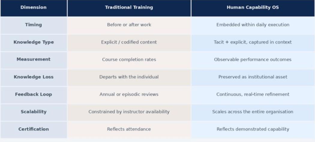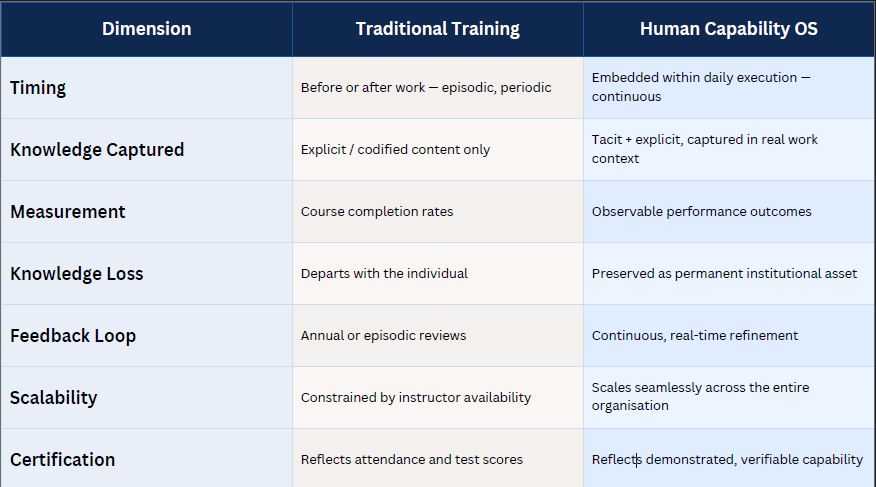 The table below provides a structured comparison of traditional training approaches against the Human Capability Operating System across seven critical organisational dimensions. This comparison underscores the categorical rather than incremental nature of the shift that HCOS represents.