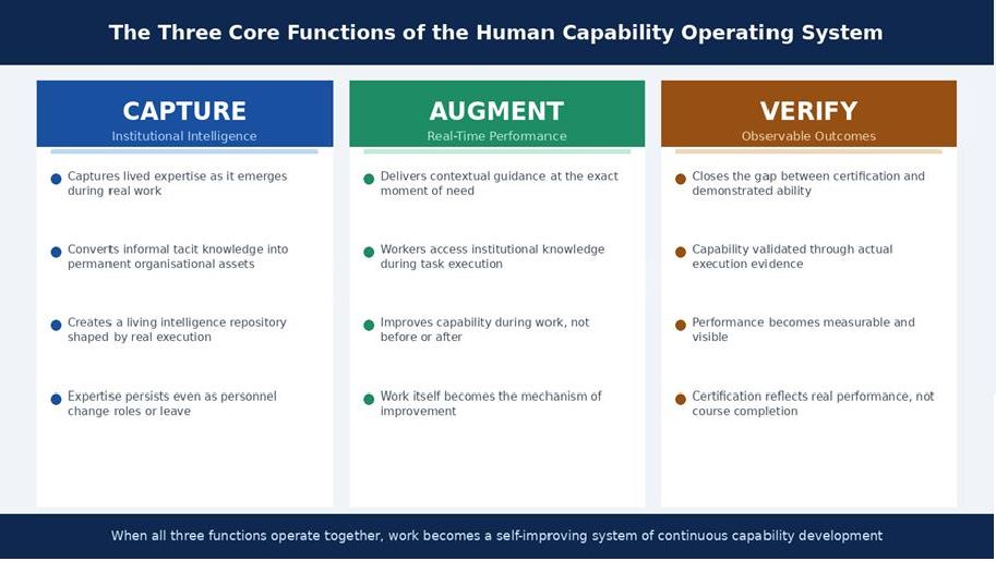 A Human Capability Operating System transforms work into a continuously improving system by performing three persistent functions simultaneously within the flow of work: capturing expertise, augmenting performance in real time and verifying demonstrated capability.
